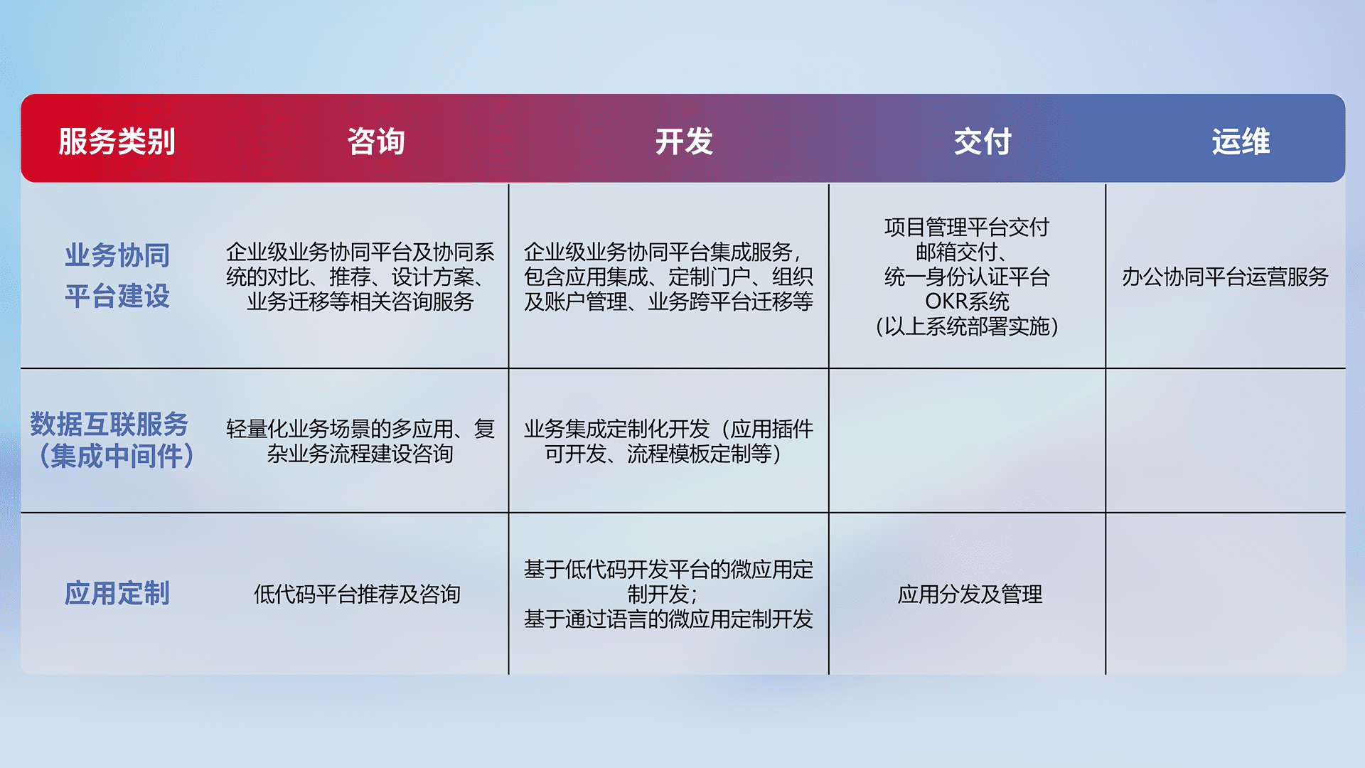 针对钉钉、、企微、、、IDaas等平台级产品提供产品的规划、、、、方案、、、、交付、、、、定制化开发等服务,,,,实现如统一协同办公、、、、智能客户服务、、混合会议管理、、、智能数据查询、、、、等业务场景,,,实现数字化转型。。。